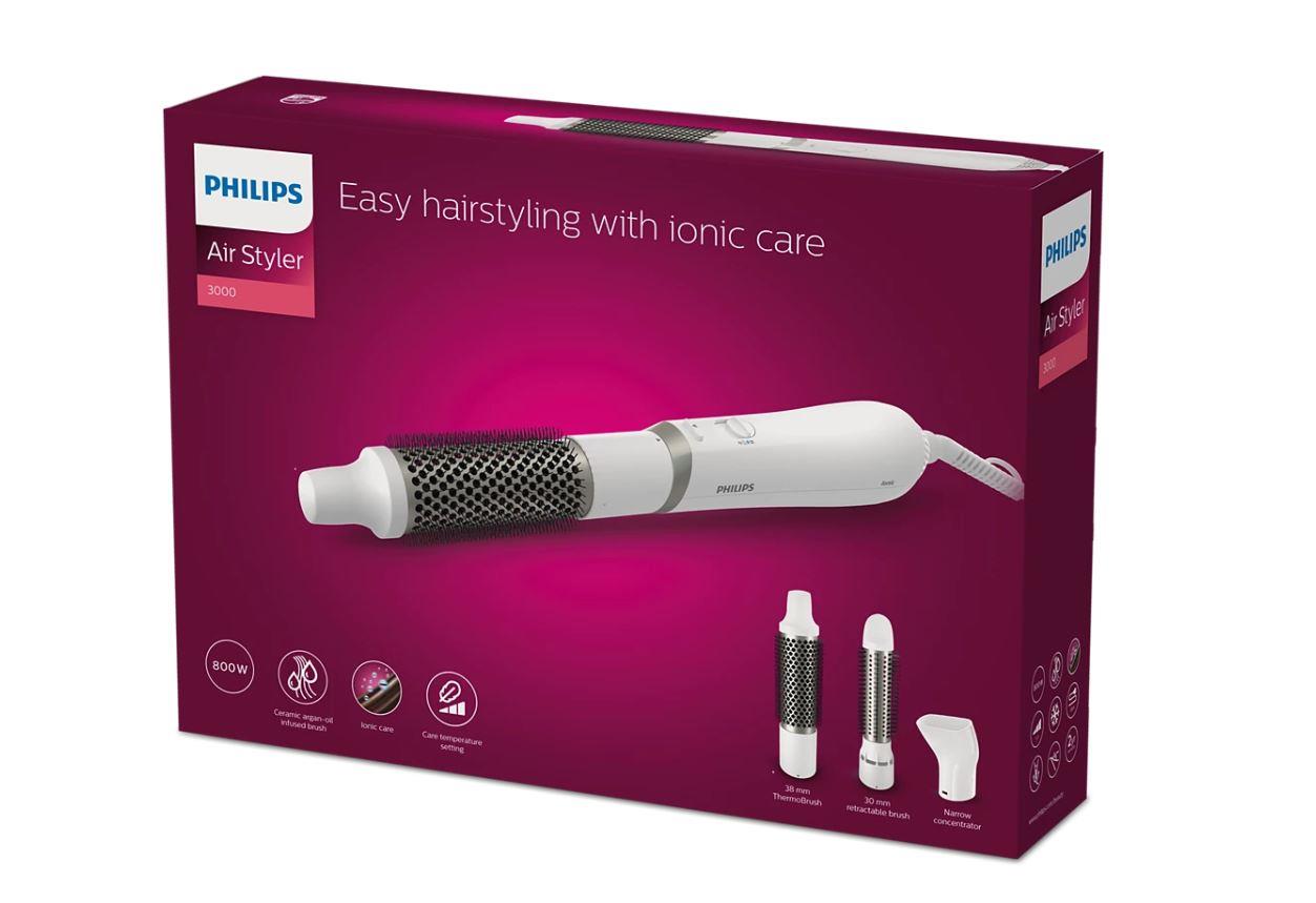 Dry and style in an instant - the Philips Air Styler 3000 lets you create beautiful, natural hairstyles while providing extra shine with ionic action. The 3 included attachments are suitable for both long and short hair, so you can style it with ease.